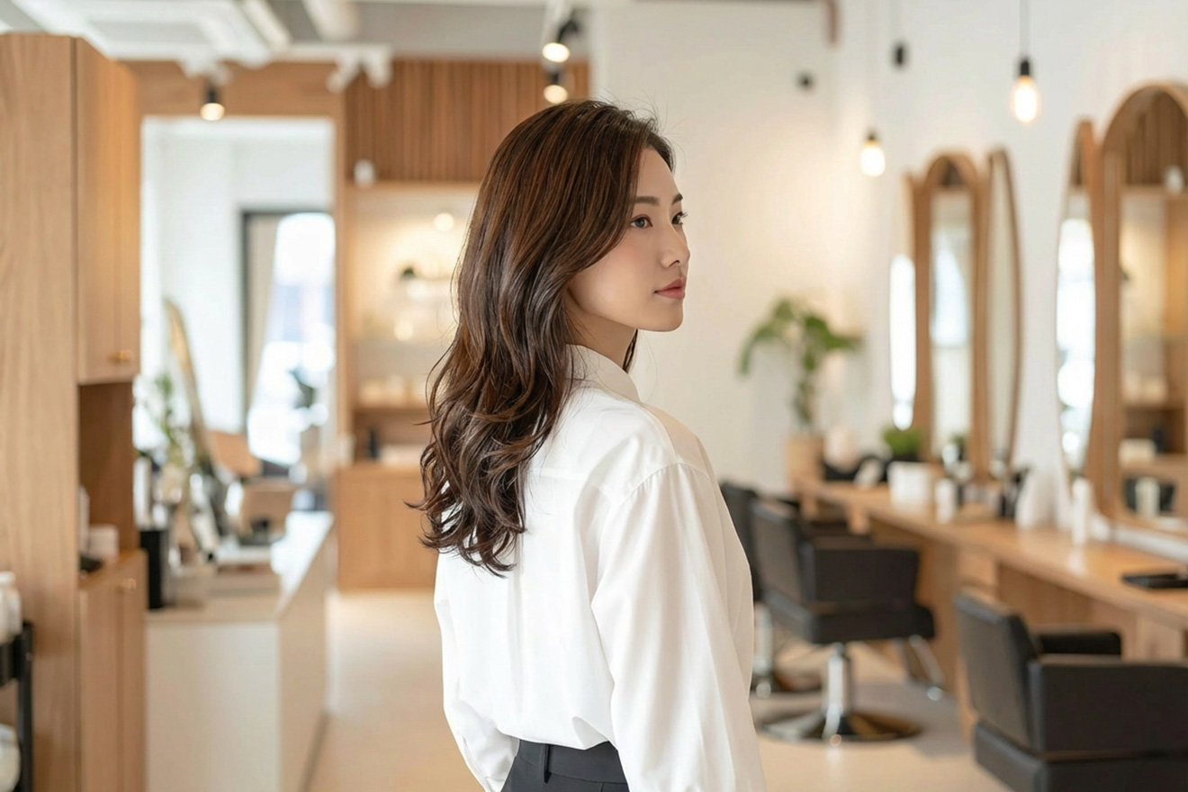 ナチュラルロングウェーブは、髪量が多くても軽やかに見せることができるロングスタイルです。柔らかい髪質と細めの髪にウェーブを加えることで、ベース型の顔型でも自然に馴染みます。ゆるやかな動きが女性らしい柔らかさを演出し、毎日のスタイリングも簡単です。
