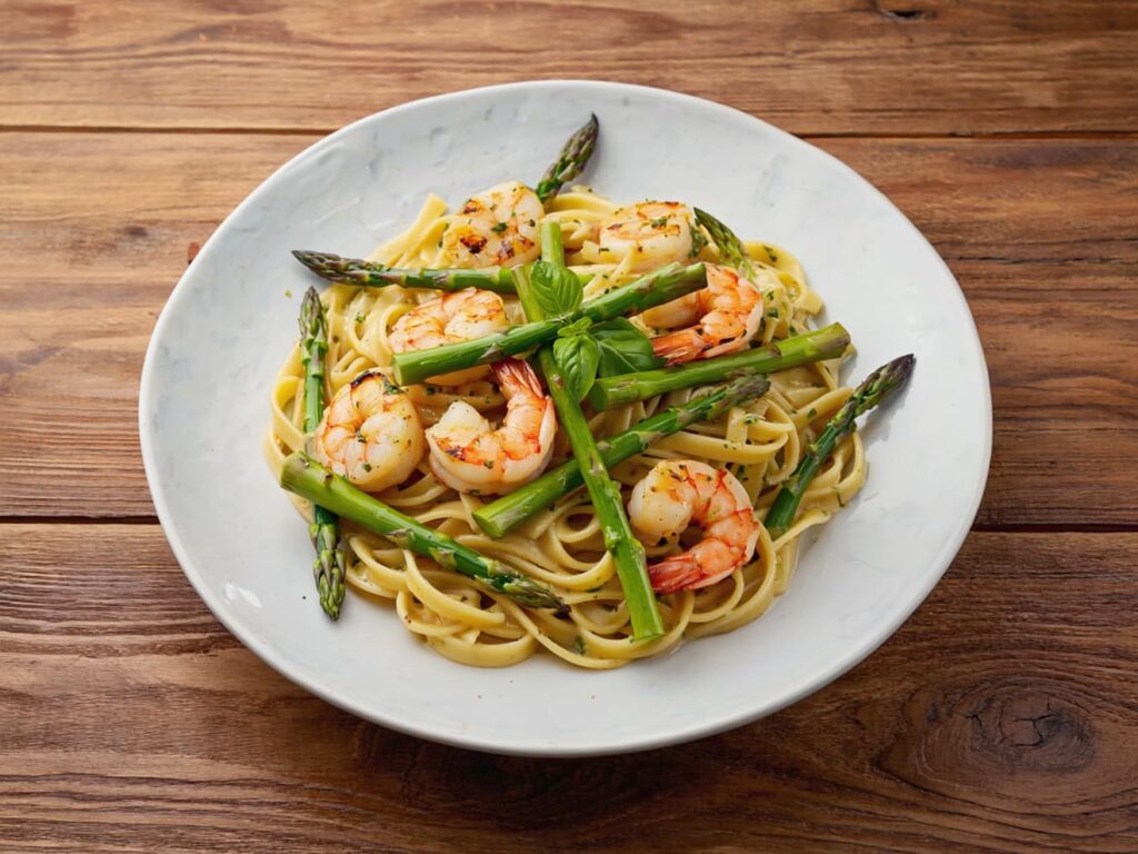 旬の魚介(例:ホタテ、アサリ)と、新鮮なアスパラガスをふんだんに使ったジェノベーゼパスタです。