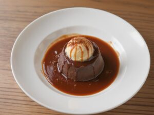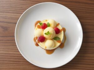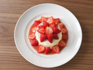 旬の桃をシロップでじっくりと煮詰めた、上品な甘さのコンポートです。爽やかな酸味のラズベリーソルベと共に、夏の暑い日でもさっぱりとお召し上がりいただけます。